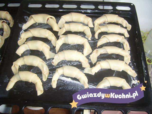 Mikserem utrzeć mąkę z miękką margaryną, dodać 6 łyżek lodowatej wody, aby ciasto zbiło się w kulę. Schłodzić, a następnie rozwałkować, wycinać trójkąty. W środek każdego trójkąta kłaść odrobinę marmolady i zwijać od podstawy trójkąta do przeciwległego rogu i formować rogaliki.