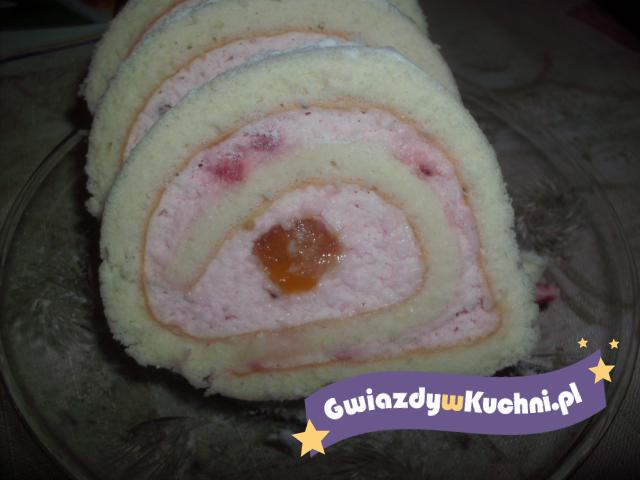 Galaretkę gotujemy zgodnie z przepisem na opakowaniu i przelewamy do płaskiego naczynia, tak by po stężeniu łatwo było kroić paski. Odstawiamy w chłodne miejsce. Przygotowujemy biszkopt: jajka rozbijamy oddzielając białka od żółtek. Białka ubiajamy na sztywno. Ciągle ubijając dodajemy cukier a następnie żółtka. Zmniejszamy obroty miksera i dodajemy mąkę przesianą z proszkiem do pieczenia. Delikatnie mieszamy. Gotowe ciasto przekładamy do prostokątnej formy i pieczemy ok. 15 min w temp. 180 stopni c. Upieczony biszkopt zwijamy w wilgotny ręcznik w rulon. Maliny rozdrabniamy melekserem. Żelatynę rozpuszczamy w niewielkiej ilości wrzątku i odstawiamy do wystudzenia a następnie mieszamy z serkiem homogenizowanym. Dodajemy kremówkę ubitą ze śmietan fixem i maliny. Dokładnie mieszamy. Biszkopt smarujemy masą. Na brzegu, który po zawinięciu będzie w środku układamy paski stężałej galaretki i -zaczynając od tego brzegu – zwijamy roladę. Odstawiamy na 3 godz. Do lodówki. Wierzch dowolnie ozdabiamy np. Pudrujemy.