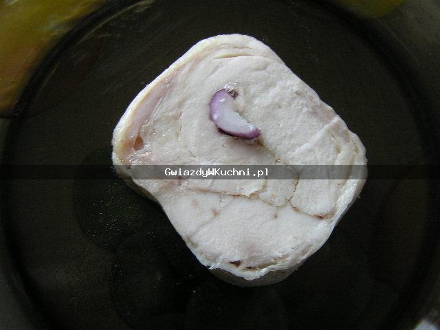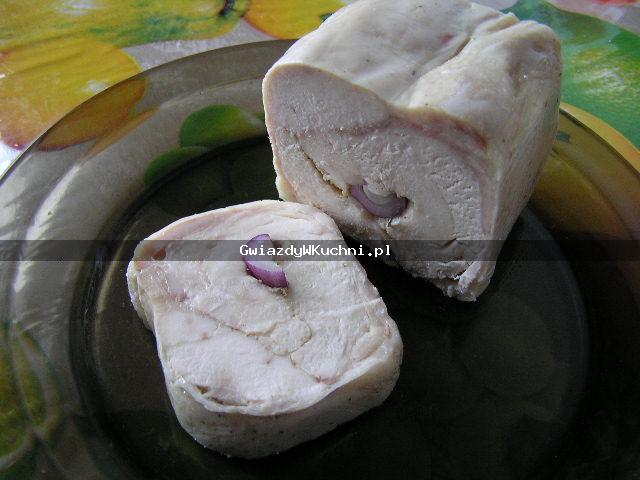 Piersi z kurczaka opłukać, przeciąć na połowy, doprawić solą, pieprzem. Odstawić na dwie godziny do lodówki. Cebulę obrać, układać na płatach mięsa, następnie zrolować. Owinąć w folię, piec w temperaturze 180 stopni, około godziny. W zależności od grubości rolady.