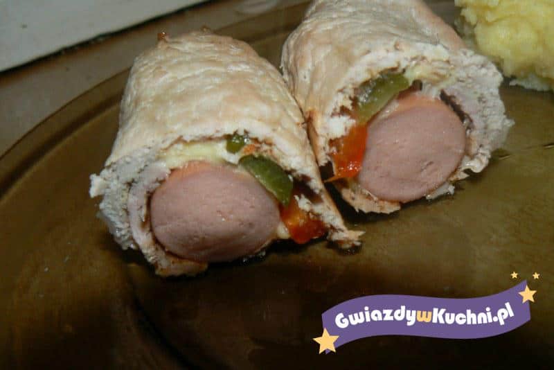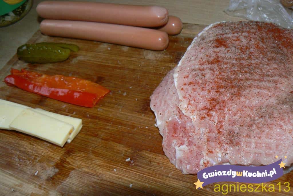 Kotlety rozbić, przyprawić, parówki obrać z foli, paprykę i ogórki pokroić w słupki. Na kotletach układać parówki, ogórki, paprykę i ser. Zwinąć. Poukładać w naczyniu żaroodpornym i upiec w piekarniku przez ok 1 godz.