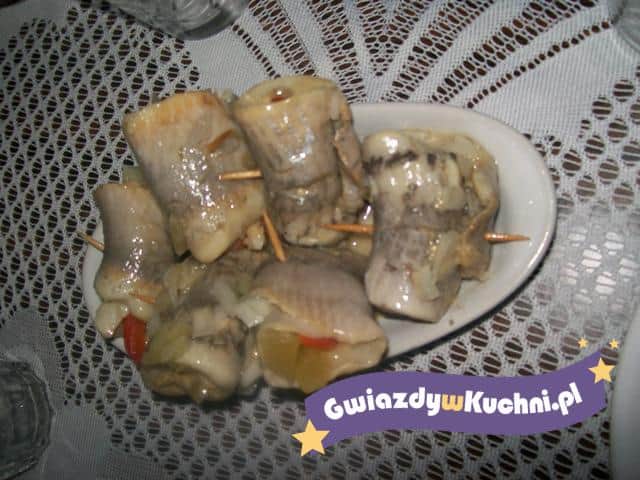 Filet śledziowe moczymy w wodzie przez całą noc. Papryki oczyszczamy, kroimy w cienkie paseczki. Ogórek również kroimy w słupki. Cebulę obieramy, drobno siekamy. Następnie na każdym filecie śledziowym układamy po kilka słupków papryki oraz ogórka, układamy odrobinę cebulki i ciasno zwijamy. Roladki spinamy wykałaczkami, aby się nie rozpadły. Układamy na półmisku, posypujemy cebulką.