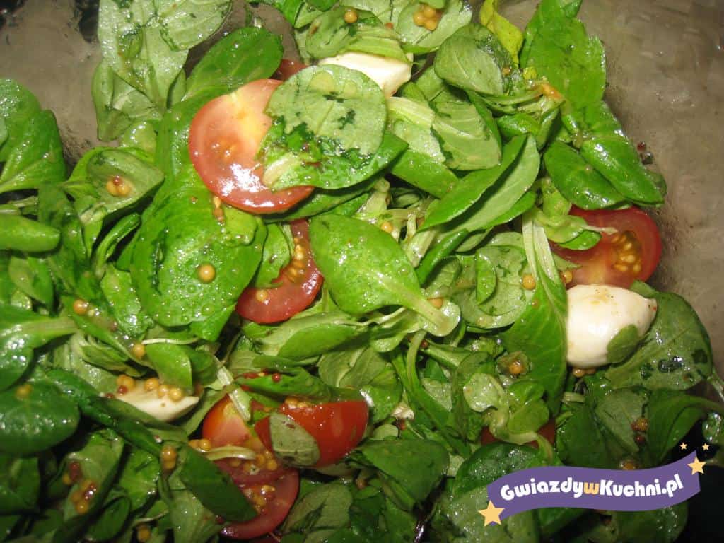 Roszponkę i pomidorki koktajlowe umyć, kulki sera mozzarelli i pomidorki pokroić na pół, wymieszać składniki razem. Przygotować sos w kubeczku, musztardę francuską, ocet jabłkowy, bazylię i przyprawy wymieszać razem, polać nim sałatkę, wymieszać i wstawić do lodówki na 15 minut, aby składniki się przegryzły.