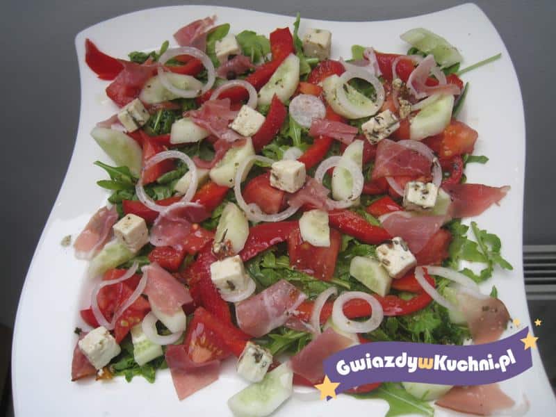 Roszponkę myjemy, nie gnieciemy i wykładamy na 2 talerze duże. Pomidor, paprykę myjemy, kroimy dodajemy na rukolę. Cebulę, ogórka obieramy i kroimy i również dodajemy na wierzch sałatki. Przygotowujemy sos z startego czosnku, oliwy z oliwek i z sosu do sałatek. Wszystkie składniki na sos mieszamy i polewamy sałatkę. Na koniec dodajemy pokrojony ser feta i szynkę schwardzwadzką. Przyprawiamy do smaku sola i pieprzem