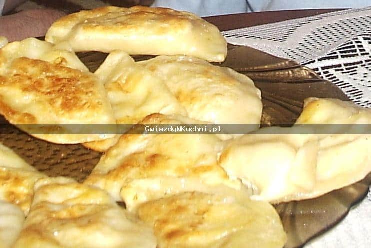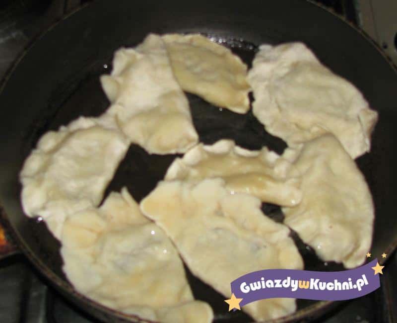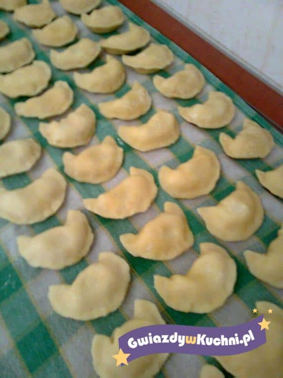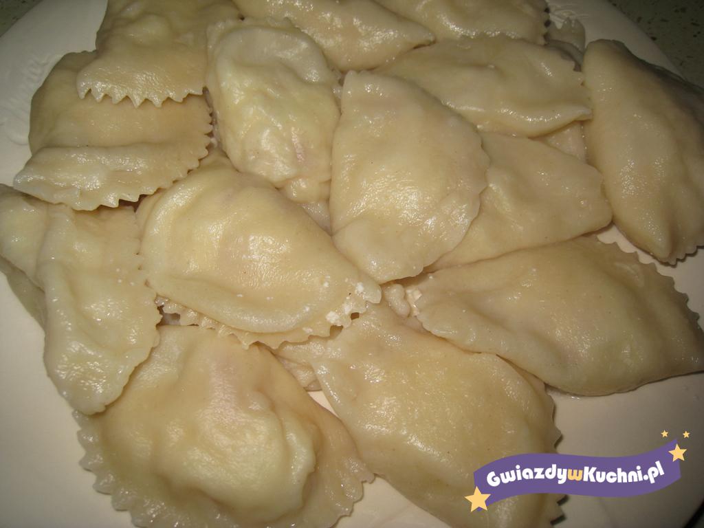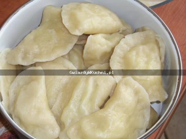 Ziemniaki należy obrać i ugotować. Cebulkę należy pokroić w drobną kosteczkę i zarumienić ją na tłuszczu. Ziemniaki po przestudzeniu należy przekręcić przez maszynkę wraz z serem i cebulą, następnie doprawić do smaku solą i pieprzem. Zagnieść gładką masę, rozwałkować, formować kulki z masy. Z mąki, jajka i wody należy zagnieść ciasto, rozwałkować je i szklanką wycinać koła. Koła należy wypełniać kulkami farszu, formować z nich pierogi. Gotować w osolonej, wrzącej wodzie do momentu wypłynięcia na wierzch, podawać polane tłuszczem ze stopionej słoniny.