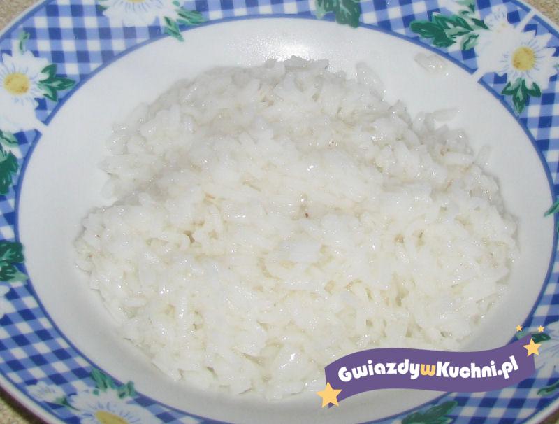 Ryż opłukać, ugotować w dużej ilości wrzącej osolonej wody, odcedzić na cedzaku, zlać pod kranem zimną wodą, odsączyć.