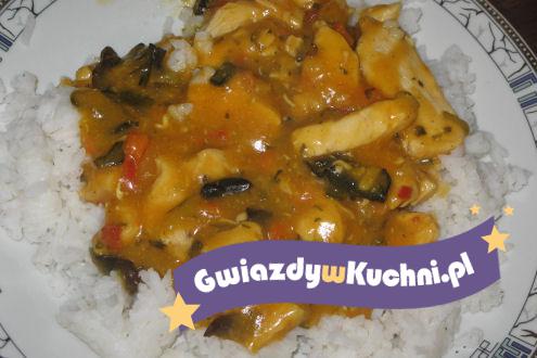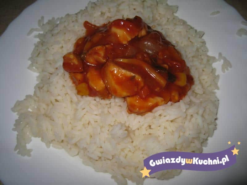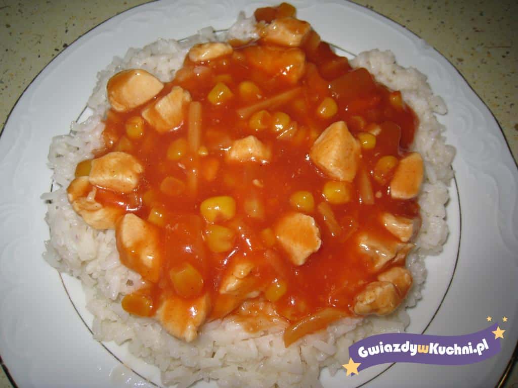 Ryż ugotować. Mięso z kurczaka pokroić w kostkę lub w paski i podsmażyć. Przygotować sos wg przepisu na opakowaniu i wlać do mięsa. Gotować ok 10 min razem. Gotowy sos dodać do ryżu.