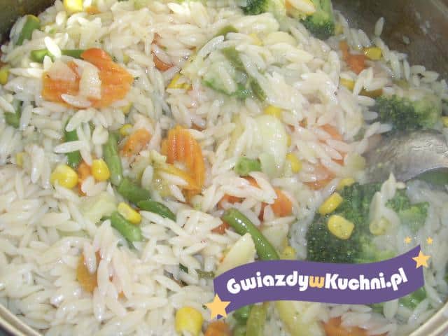 Ugotować ryż dodając soli i 1/2 łyżeczki przyprawy (trzeba sprawdzić czy przyprawa jest słona, wówczas dodajemy mniej soli). Następnie ryż wrzucamy na patelnię i podsmażamy krótką chwilę. Teraz wrzucamy warzywa i całość ponownie przyprawiamy do smaku. Podsmażamy do chwili aż warzywa będą miękkie.