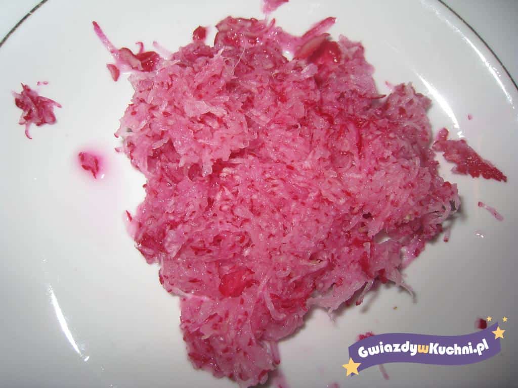 Rzodkiewki umyć i zetrzeć drobniutko na tarce, wymieszać z jogurtem i dodać troszkę soli do smaku i cukru.