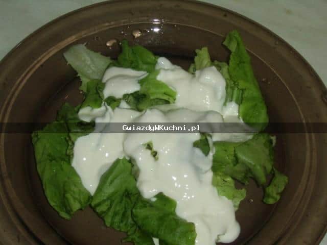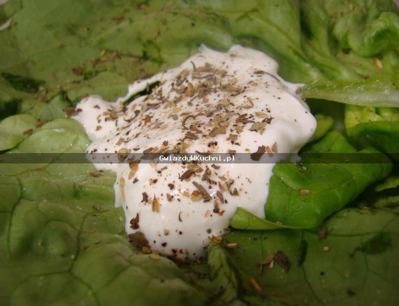 Sałatę dokładnie umyć, osączyć, porwać na kawałki, przełożyć do salaterki. Cebulę obrać, drobno posiekać. Śmietanę połączyć z octem, dodać sól, pieprz, cebulę dymkę, Wszystkie składniki wymieszać i polać sałatę.Posypać pociętym szczypiorkiem, dla dekoracji.