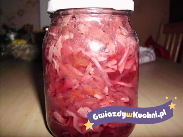 Buraki ugotować, obrać i zetrzeć na tarce o dużych oczkach. Kapustę poszatkować, ugotować, odcedzić. Cebulę pokroić w piórka. Warzywa wymieszać. Przygotować zalewę z oleju, octu, cukru, wody i soli i gorącą zalać warzywa. Wymieszać. Przełożyć do słoików. Pasteryzować 15 min.