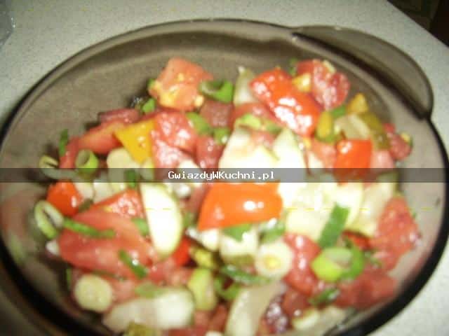 Szczypiorek z cebulką drobno kroimy. Warzywa kroimy w grubszą kostkę.Wszystko razem mieszamy, doprawiamy solą i pieprzem.