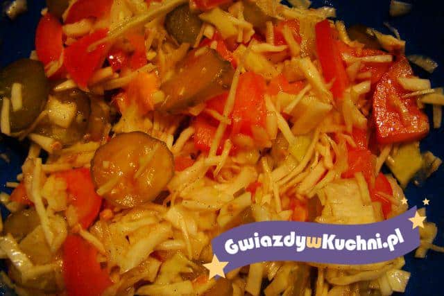 Biała kapustę, cebulę siekamy dodajemy pokrojone pomidory ogórek i paprykę. Solimy, pieprzymy i dodajemy oliwę. Mieszamy .