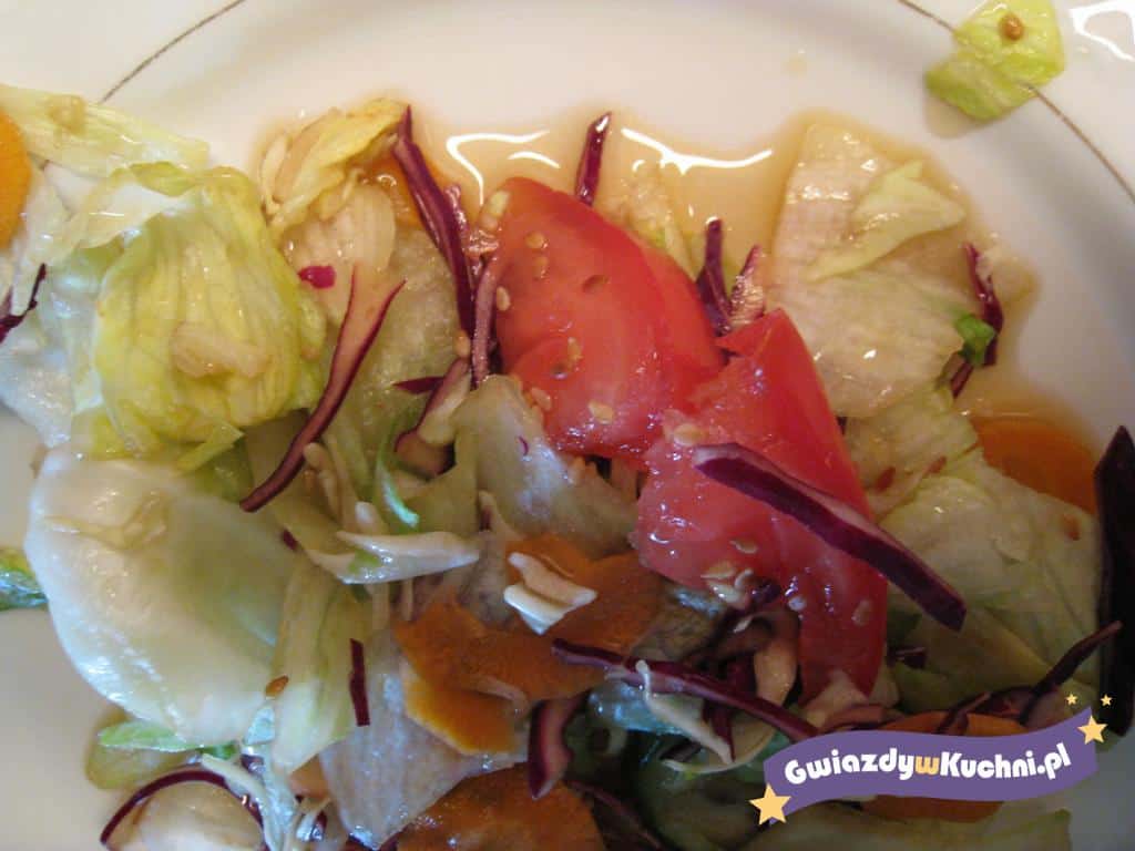 Marchewkę obrać i pokroić w cieniutkie plasterki, ugotować na półtwardo we wrzątku, ostudzić. Kapustę czerwoną również pokroić i ugotować w tej samej wodzie co marchewkę. Do miski włożyć porwaną sałatę lodową, dodać marchewkę, czerwoną kapustę, pokrojonego pomidora na duże kawałki, pokrojonego ogórka na półplasterki, całość polać sosem sojowym wymieszanym z sezamem i dokładnie wymieszać. Odstawić na 15 minut aby smaki się przegryzły.