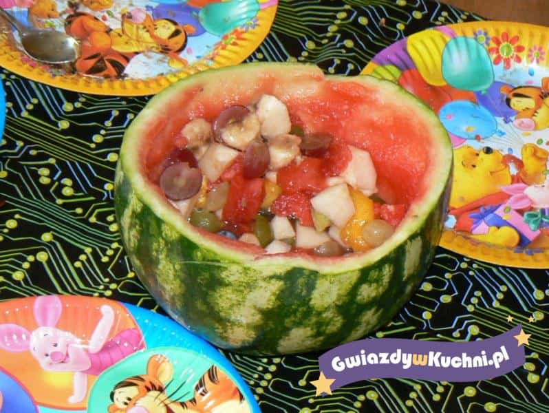 Wszystkie owoce umyć. Arbuza przeciąć w 1/3 wysokości. Ostrożnie wydrążyć. 1/3 pokroić w kostkę, resztę zużyć do czegoś innego. Większe winogrona przeciąć na pół, banana pokroić w plastry, jabłka, kiwi i brzoskwinię obrać, pokroić w kostkę, wszystko wymieszać i włożyć do większej części arbuza.