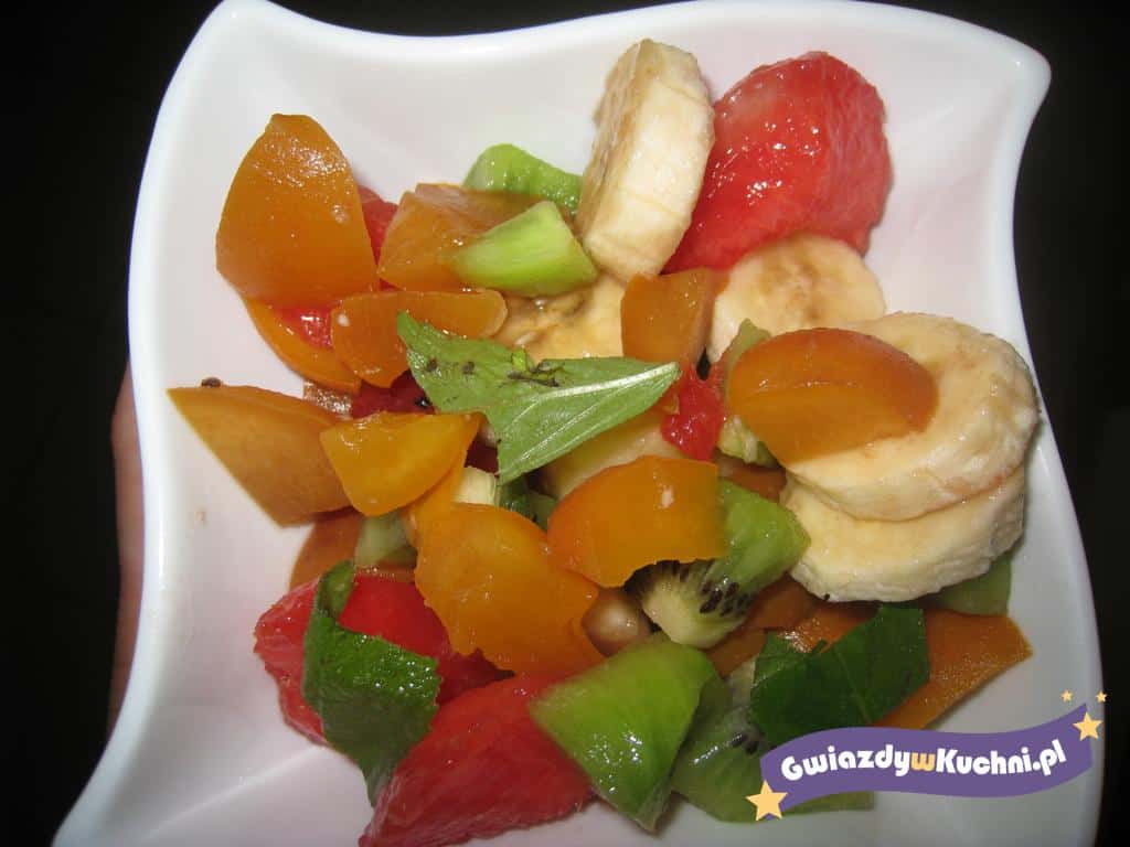 Miętę umyć i porwać na mniejsze kawałki. Banana pokroić na plastry. Brzoskwinie, arbuza i kiwi pokroić na kwadraty. Owoce polać syropem brzoskwiniowym i dodać miętę, wszystko razem wymieszać.