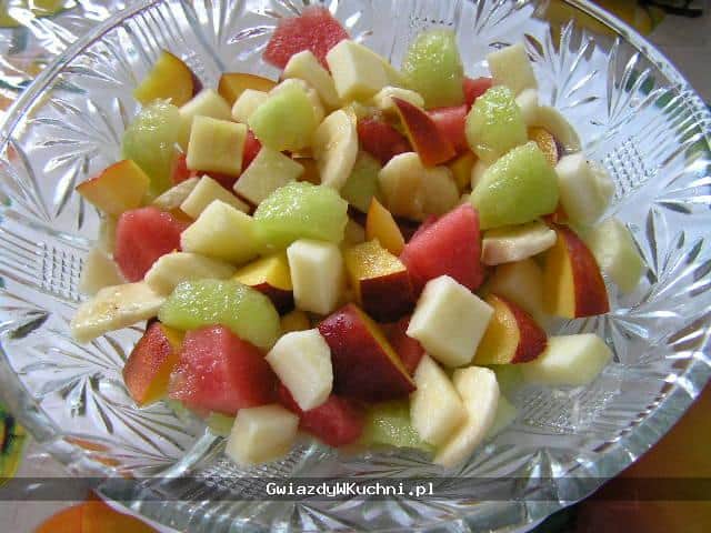 Z melona usunąć gniazdo z nasionami, wybrać miąższ i pociąć w kostkę. Z arbuza wybrać pestki, wykroić w kostkę. Banany i jabłka obrać, pokroić w kostkę. Nektarynki pociąć w cząstki. Wycisnąć sok z cytryny i skropić owoce. Wymieszać. Sok z pomarańczy połączyć z miodem i polać sałatkę. Podawać schłodzoną.