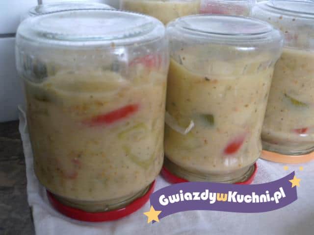 Pokrojone ogórki, paprykę, cukinię posolić i odstawić na dwie godzinki. Do garnka włożyć wszystkie składniki na zalewę i zagotować. Do wrzącej zalewy przełożyć osączone warzywa, dokładnie wymieszać i zdjąć z ognia. Powkładać do czystych słoików i mocno zakręcić. Pasteryzować przez ok. 15 minut.