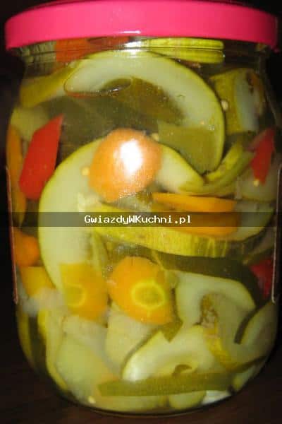 Cukinię pokroić w cienkie plasterki, marchewkę także. Cebulę i paprykę pokroić dowolnie. Warzywa wymieszać i odstawić. W tym czasie przygotować zalewę : z wody, octu, oleju i soli. Dodać wg uznania pieprz, ziele i liście laurowe. Warzywa odsączyć i połączyć z zalewą. Przełożyć do słoików i pasteryzować przez 15-20 min.