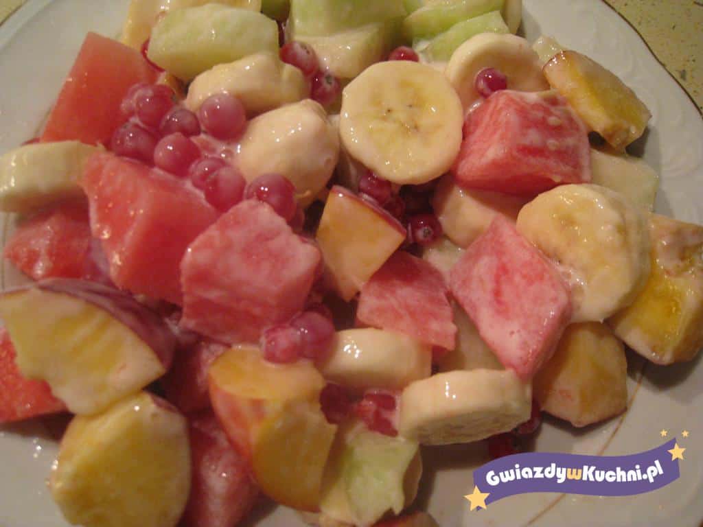 Z arbuza odkroić skórę, wyjąć delikatnie pestki i pokroić na małe kawałki. Porzeczki delikatnie umyć i delikatnie osuszyć na ręczniku papierowym, aby obciekły wodą. Melona pokroić na kawałki, takiej samej wielkości jak kawałki arbuza. Banana pokroić na plasterki. Z brzoskwiń wyjąć pestki i pokroić na kawałeczki. Wszystkie owoce delikatnie połączyć razem, polać jogurtem greckim i delikatnie wymieszać, podawać sałatkę schłodzoną.