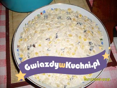 Czerwoną fasolę przełożyć na sitko, opłukać pod bieżącą wodą, dobrze osączyć. Kukurydzę również osączyć z zalewy. Cztery plasterki szynki odłożyć do dekoracji, pozostałe pokroić w kostkę. Fasolę wymieszać z kukurydzą, szynką, cebulą i majonezem. Sałatkę przyprawić solą i świeżo zmielonym pieprzem. Przełożyć do 4 miseczek. Koperek opłukać, osuszyć, zawinąć w plasterki odłożonej wędliny. Rulonikami z szynki udekorować gotową sałatkę.