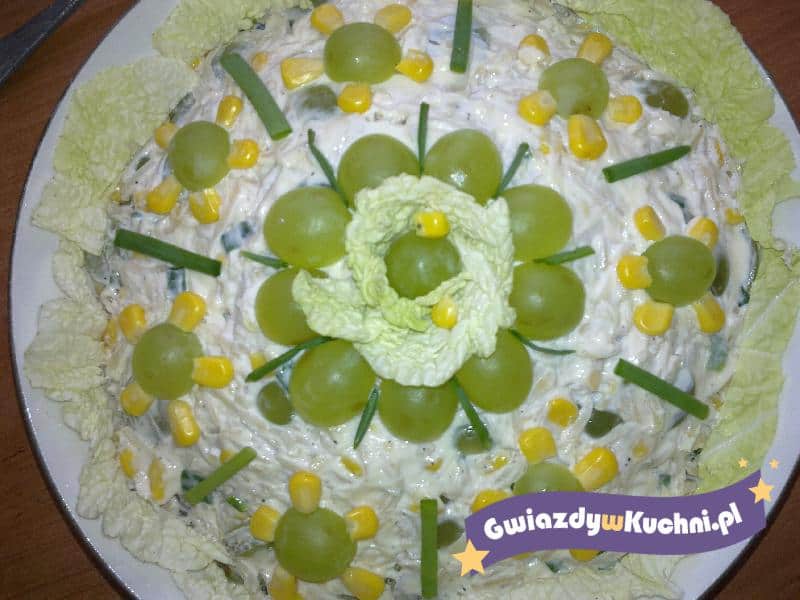 Kukurydzę osączyć z zalewy. Pierś ugotować w posolonej wodzie, ostudzić i pokroić w kostkę. Seler odcisnąć z soku i posiekać na drobniej. Cebulki posiekać wraz ze szczypiorkiem. Umyte winogrona przekroić na połówki (kilka kawałków odłożyć do dekoracji). Wszystkie składniki wymieszać z majonezem i doprawić do smaku solą i świeżo zmielonym pieprzem.