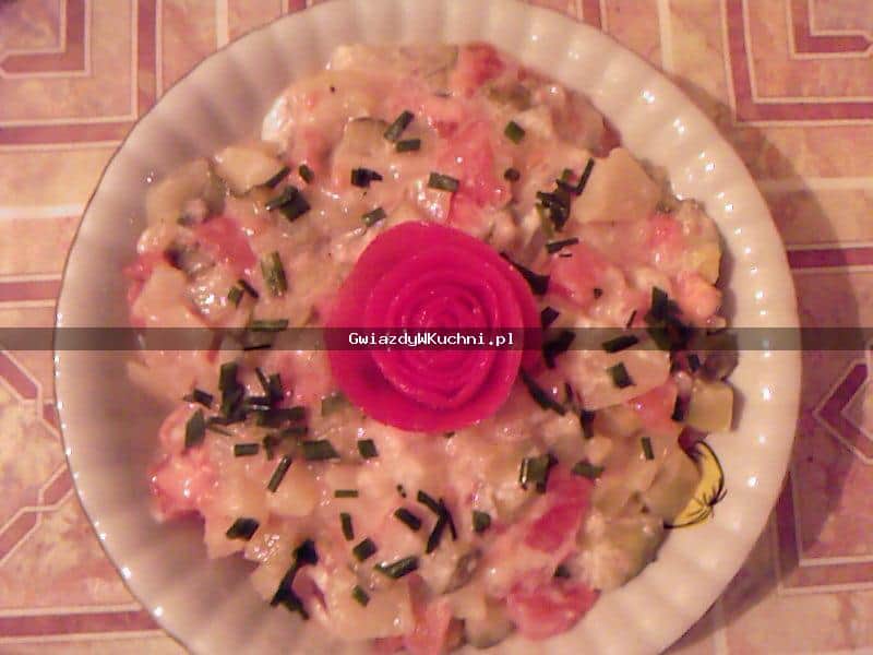 Ziemniaki umyć, gotować w osolonej wodzie pod przykryciem. Odcedzić, odparować, obrać, pokroić w plasterki. Gorące ziemniaki skropić octem, odstawić do ostygnięcia.