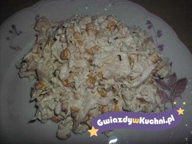 Kapustę pekińską oczyszczamy z wierzchnich liści i drobno szatkujemy, oprószamy solą, lekko wyciskamy i odstawiamy na 20 min. Ananasa kroimy w kosteczkę. Jabłko obieramy, wykrawamy gniazdo nasienne i również kroimy w kostkę. Żółty ser kroimy w drobniutką kostkę lub ścieramy na tarce o dużych oczkach. Szynkę konserwową kroimy w kostkę. Kukurydzę odsączamy. Do kapusty pekińskiej dodajemy pozostałe składniki i mieszamy. Dodajemy majonez i doprawiamy do smaku. Mieszamy.