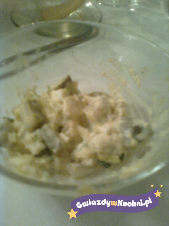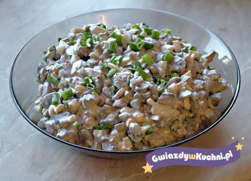 Pieczarki pokroić w kostkę następnie sparzyć, posolić , odcisnąć. Jajka i szczypiorek posiekać, dodać do pieczarek. Posolić i popieprzyć. Wymieszać. Dodać majonez. Odstawić na 20 minut do lodówki.