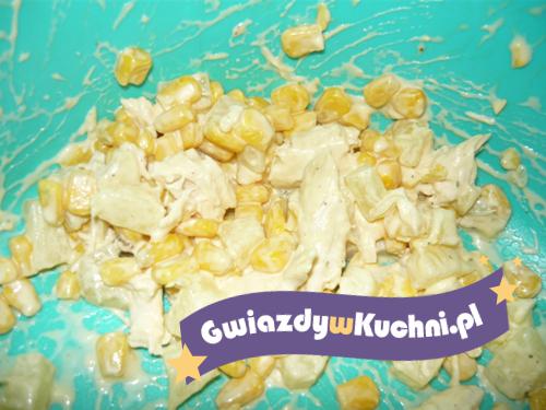 Dodać kukurydzę odsączoną, groszek konserwowy, sól i pieprz, majonez, wymieszać.