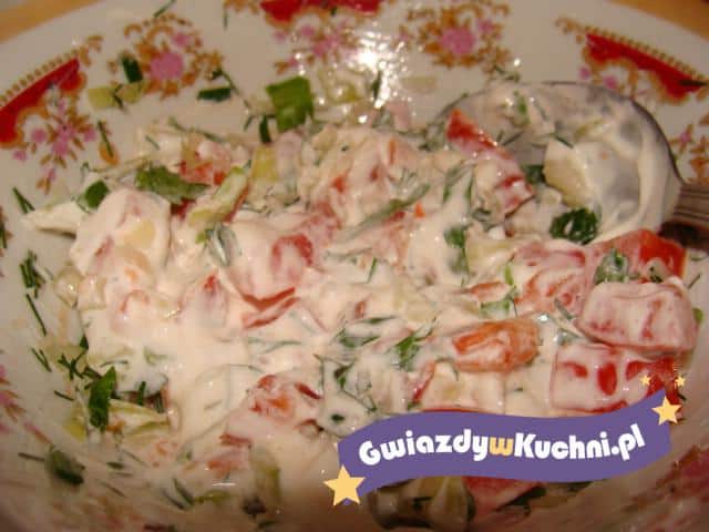 Pomidora należy dokładnie umyć pod bieżącą wodą następnie osuszyć i pokroić w kawałki, cebulkę należy posiekać w drobną kosteczkę, wszystko wrzucić do salaterki. Do warzyw należy dodać koperek i natkę pietruszki, oliwę oraz śmietanę, przyprawić do smaku solą i pieprzem, następnie dokładnie wymieszać.