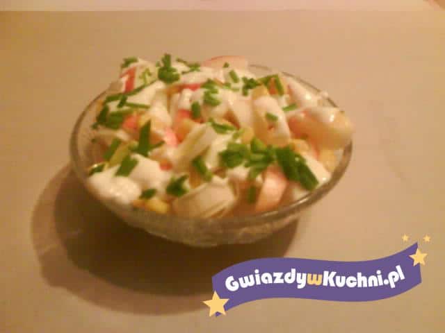 Kukurydzę odcedzić. Ziemniaki obrać, ugotować, wystudzić i pokroić w plastry. Jabłko umyć, wydrążyć gniazdo nasienne i pokroić w półplasterki. Pora oczyścić i pokroić w plastry. Wszystkie składniki połączyć, oprószyć pieprzem. Śmietanę wymieszać z jogurtem, doprawić solą i polać sałatkę. Posypać posiekanym szczypiorkiem.