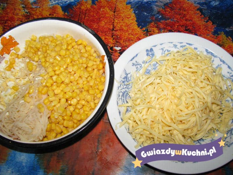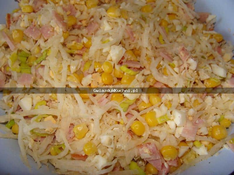 Seler i kukurydzę odsączyć, jajka i szynkę pokroić w kostkę. Wymieszać wszystko z majonezem, doprawić solą i pieprzem.