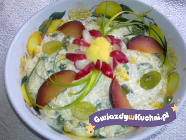 Winogrono umyć i pokroić na ćwiartki. Kukurydzę odcedzić z zalewy. Seler odcisnąć z nadmiaru soku i pokroić. Wszystkie składniki wymieszać z majonezem, posiekaną cebulą razem ze szczypiorkiem. Doprawić majonezem do smaku solą i pieprzem. Sałatkę dokładnie wymieszać i przed podaniem schłodzić w lodówce.