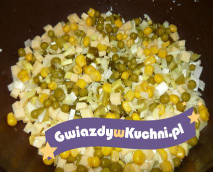 Jajka posiekać, dodać groszek, kukurydzę, majonez, por pokrojony, sól i pieprz, dobrze wymieszać.