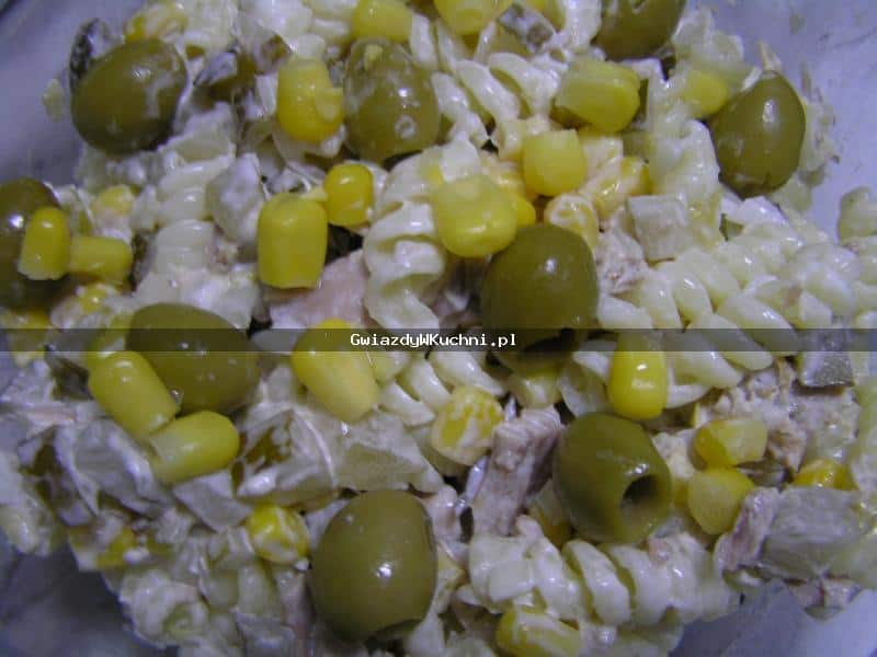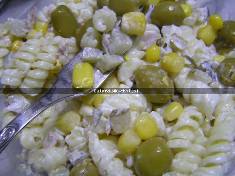 Makaron ugotować. Ogórki i cebulę pociąć w kostkę. Dodać kukurydzę z puszki oraz tuńczyka. Wszystkie składniki wymieszać z majonezem. Na końcu doprawić do smaku przyprawami.