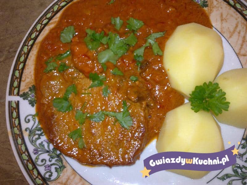 Umyte, osuszone plastry schabowe podsmażyć na rozgrzanym oleju na rumiany kolor i przełożyć na talerz. Cebulę obrać i posiekać, zeszklić, podlać bulionem, dodać przyprawy, (gorczycę rozgnieść) mięso, przykryć i dusić ok 30 min. Po tym czasie dodać paprykę (umyć, usunąć gniazdo nasienne i pokroić w kostkę), koncentrat, śmietanę i jeszcze dusimy jakieś 10 min. Na koniec posypać zieleniną. Podajemy z ziemniakami lub pieczywem.