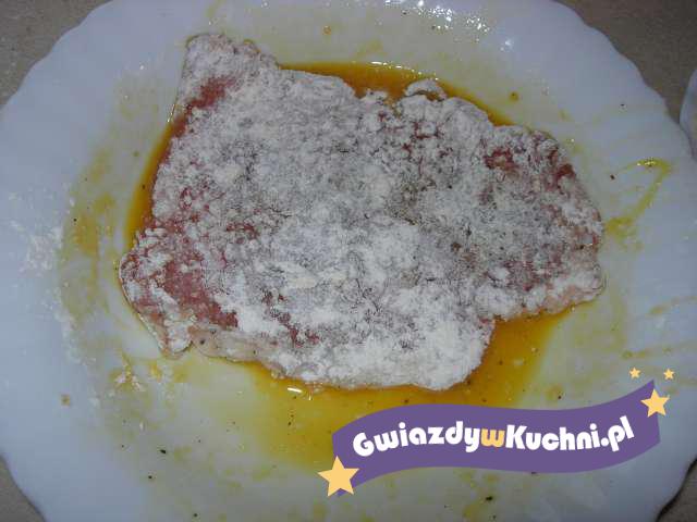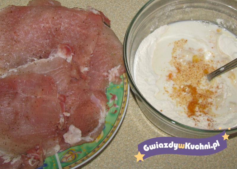 Schab pokroić w plastry, stłuc tłuczkiem i posypać solą i pieprzem, ze składników na ciasto wyrobić dokładnie i maczać w tym kotlety i smażyć.