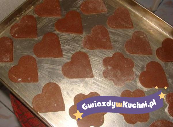Masło, cukier i miód należy zagotować w garnuszku, wystudzić i dodać jajka, wszystko dokładnie wymieszać. Do mąki pszennej należy dodać proszek do pieczenia, kakao i przyprawę do pierników, następnie masę miodową i dokładnie zagnieść ciasto, po czym je schłodzić. Ciasto po schłodzeniu należy rozwałkować i wycinać z niego serduszka. Piec około 15- 20 minut w piekarniku nagrzanym do 180 stopni. Z cukru pudru, białka i soku z cytryny należy ukręcić lukier i lukrować nim ciasteczka.