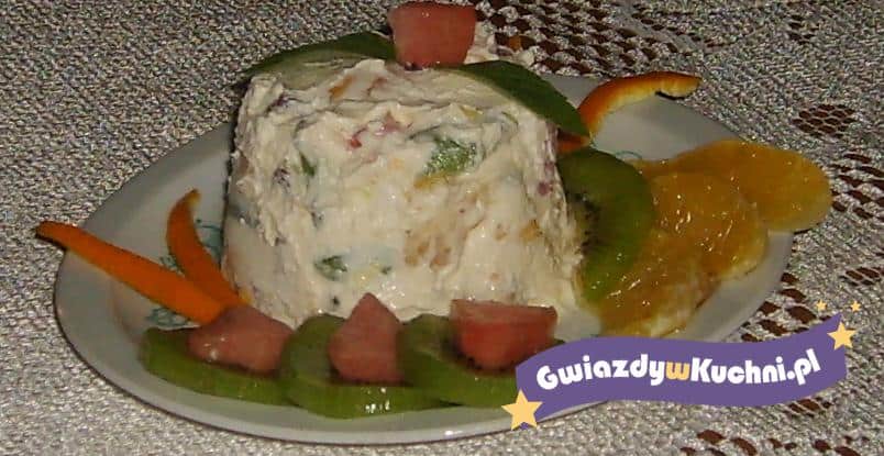 Owoce umyć i obrać. Pokroić na małe kawałki. Serek rozetrzeć z cukrem waniliowym i wymieszać razem z owocami.