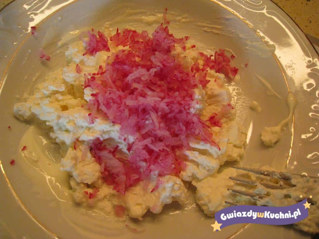 Cebulkę obrać i drobniutko zetrzeć na tarce, również rzodkiewki zetrzeć drobniutko na tarce. Ser biały rozgnieść widelcem, dodać startą cebulkę i rzodkiewki, dodać śmietanę, sól zwykłą oraz czosnkową i pieprz. Wszystkie składniki dobrze wymieszać.