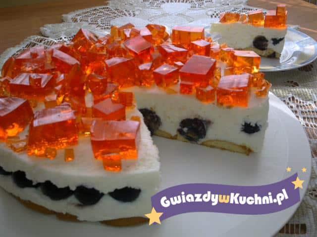 Galaretkę przyrządzić według przepisu na opakowaniu. Serki przełożyć do wysokiego naczynia i spienić mikserem. Schłodzone mleko wlać do osobnego naczynia i ubić śnieżkę. Żelatynę rozpuścić w odrobinie gorącej wody i przestudzić. Śmietanę wymieszać z serkami i żelatyną. Dokładnie wymieszaną masę, połowę porcji wyłożyć na dno tortownicy wyłożonej biszkoptami. Po całości rozłożyć umyte winogrono i przykryć drugą połową masy. Na wierzch położyć galaretkę. Całość należy schłodzić w lodówce najlepiej przez noc.
