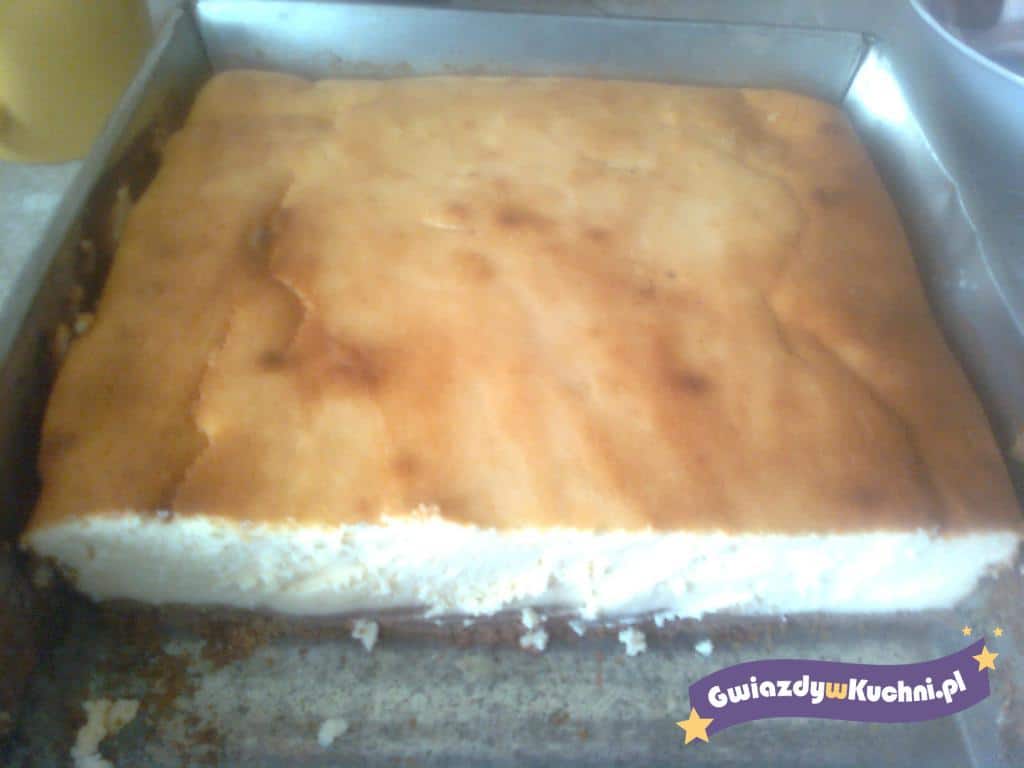 Lekko wymieszać, wyłożyć na ciasto. Wstawić do dobrze nagrzanego piekarnika na 60 minut. Ostudzone ciasto posypać cukrem pudrem.