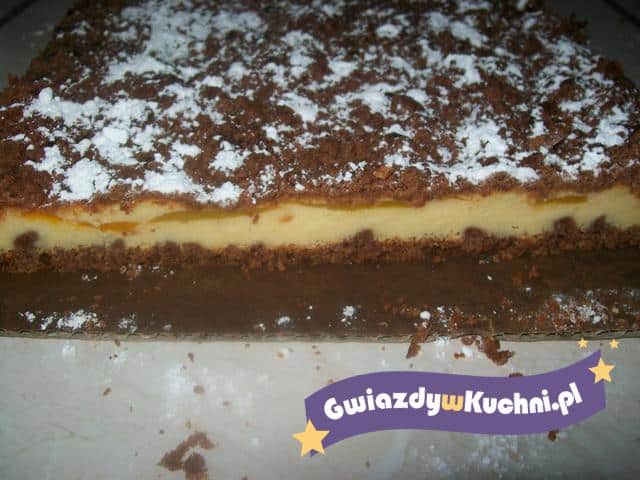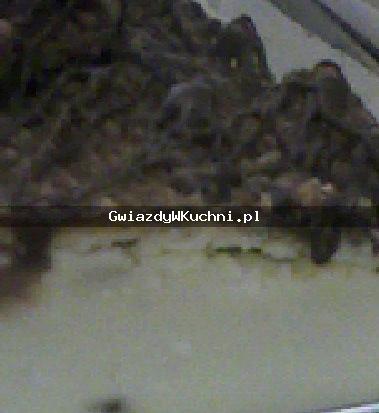 Formę wyłożyć papierem do pieczenia. Jedna cześć ciasta zetrzeć na dużych oczkach na cały spód blachy. Wyłożyć masę serową i na wierzch zetrzeć druga cześć ciasta.