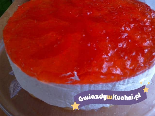 Blat o śr. 26 cm (można użyć biszkopty) ułożyć na talerzu, założyć obręcz, przełożyć masę sernikową, wyrównać i wstawić do lodówki, aby stężało.