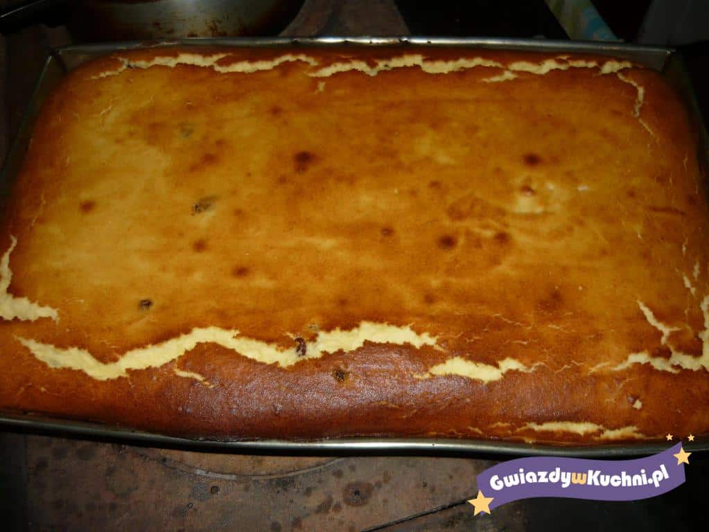 Ucierać w makutrze żółtka z cukrem, dodać margarynę, twaróg, aromat i ewentualnie bakalie. Dosypać 4 łyżki puree ziemniaczanego. Na końcu ubić pianę z białek i wymieszać delikatnie z masą. Wytężyć wszystko do wysmarowanej tłuszczem i wysypanej tartą bułką tortownicy. Piec na małym, ogniu ok, 1 godziny.