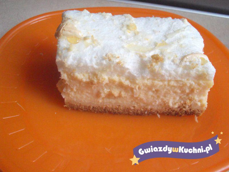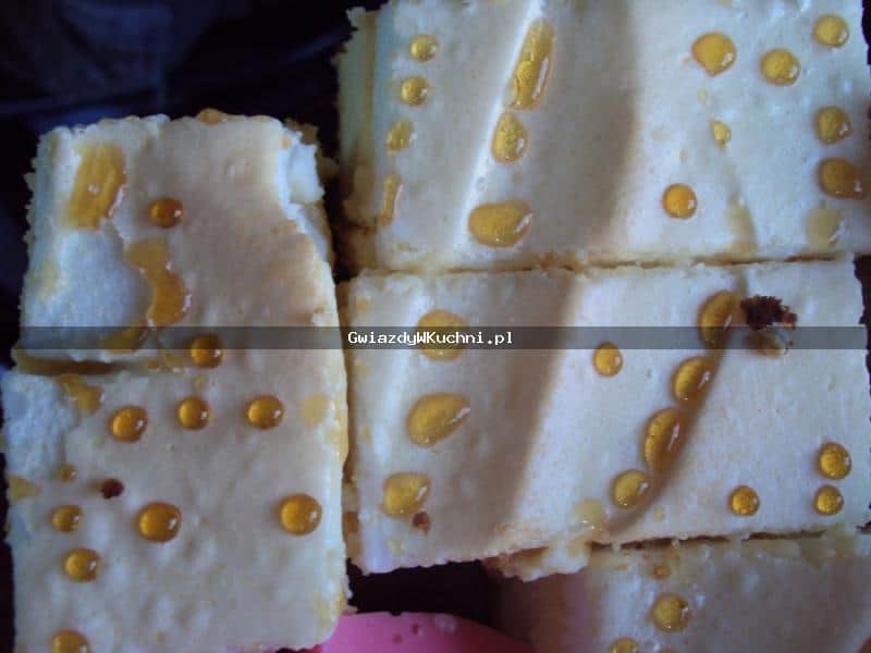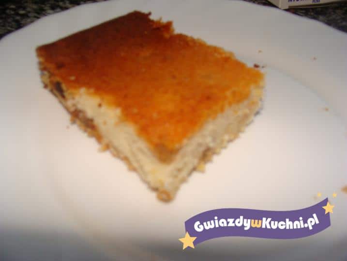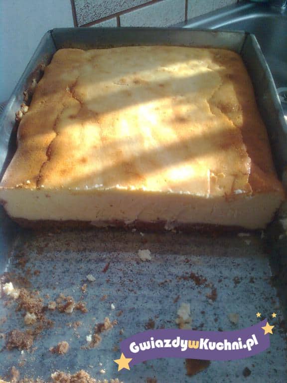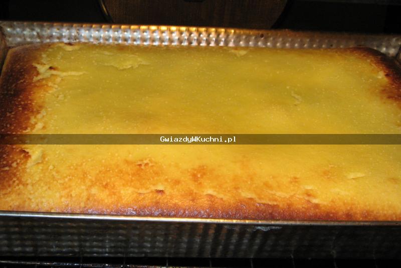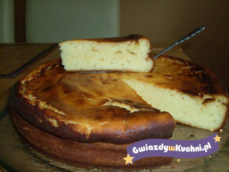 Ser przepuścić 2 razy przez maszynkę. Żółtka utrzeć z cukrem oraz stopionym masłem i połączyć z serem. Dokładnie mieszając, dodać mąkę ziemniaczaną i dodatki aromatyczne. Na końcu wymieszać lekko ze sztywną pianą ubitą z białek. Formę wysmarować tłuszczem i wysypać tartą bułką. Włożyć do niej masę, smarując po wierzchu białkiem. Piec ok. 45 min, w temperaturze 130 stopni C. Pozostawić w otwartym wygaszonym piekarniku ok.10 min. Wyjmować z formy po całkowitym ostygnięciu.