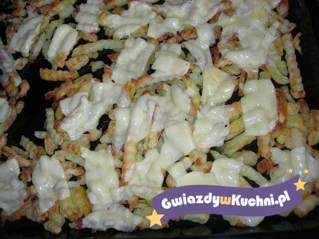 Frytki układamy na blaszce do pieczenia, wkładamy do piernika na 20 minut. Ser kroimy w plastry. Wyjmujemy frytki, układamy na nich plastry sera, zapiekamy 10 minut.