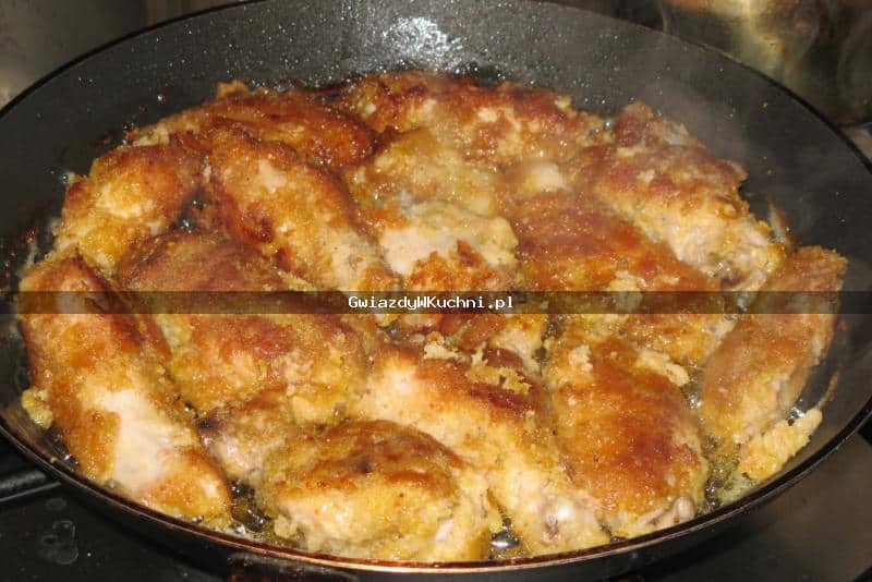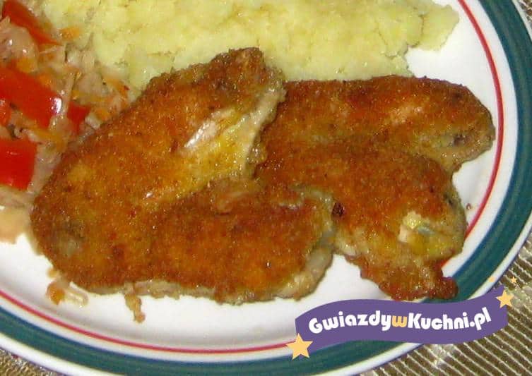 Ze skrzydełek odciąć lotki, a następnie skrzydełka przekroic na połowy. Jajka rozbić, posolić i dodać przyprawę do kurczaka, dobrze rozbić widelcem. Skrzydełka obtoczyć najpierw w jajku a następnie w bułce tartej. Smażyc na rozgrzanym oleju ok 20 min.