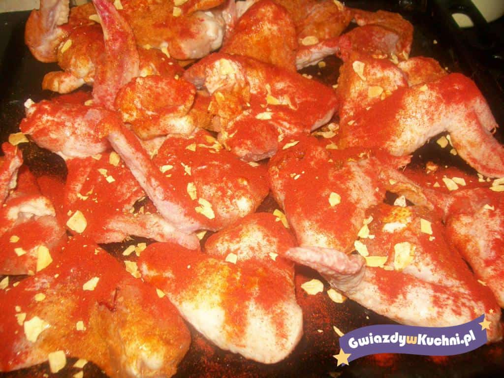 Skrzydełka myjemy, przyprawiamy, pieczemy na blaszce w temp. 180 stopni ok. 45 min. Przed pieczeniem koniecznie polejmy skrzydełka oliwą żeby nie były za suche.