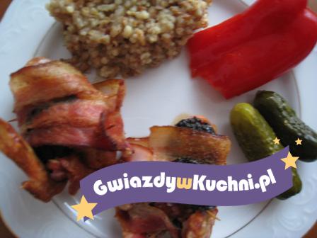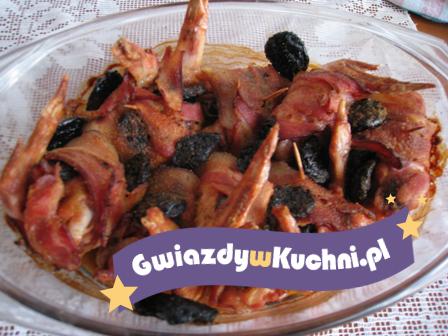Skrzydełka umyć i osuszyć, oprószyć przyprawami, odstawić na pół godzinki do lodówki. Suszoną śliwkę wkładamy pomiędzy ramiona skrzydełka i zawijamy w cienki plaster wędzonego boczku przekrojonym wzdłuż na pół. Spinamy wykałaczką. Pozostałe śliwki układamy na skrzydełkach piec przez 50 minut w temperaturze 150°c. Koniecznie wyjmujemy wykałaczki przed podaniem.